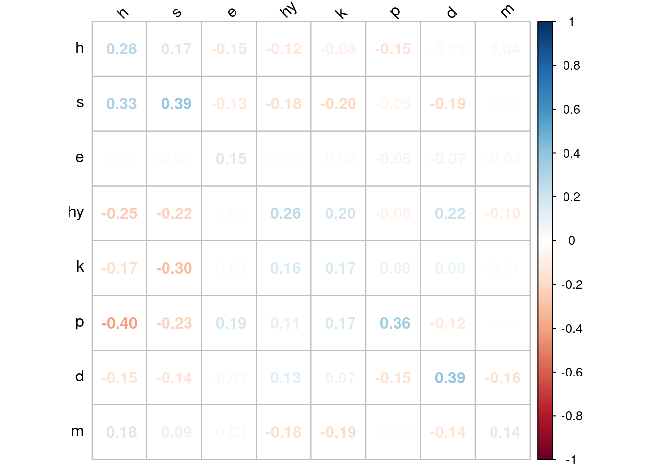 C’est la diagonale qui nous intéresse particulièrement car elle indique le lien entre les choix faits à l’avant-plan et à l’arrière-plan pour chaque facteur. Les huit corrélations sont toutes significatives à p < .001 et indiquent un lien positif entre les choix opérés à l’avant-plan et ceux opérés à l’arrière-plan. Nous remarquons que ce lien est le plus élevé pour les facteurs s et d mais plus faible pour les facteurs e, k et m.